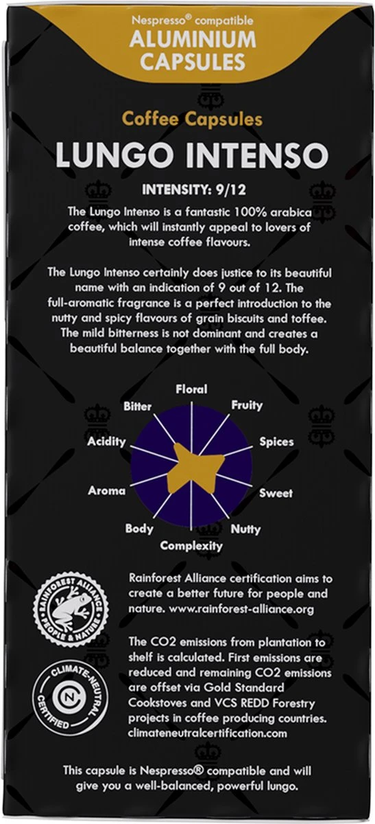 - Lungo Intenso: 20 capsules, 100% Arabica, Intensiteit 9 van 12